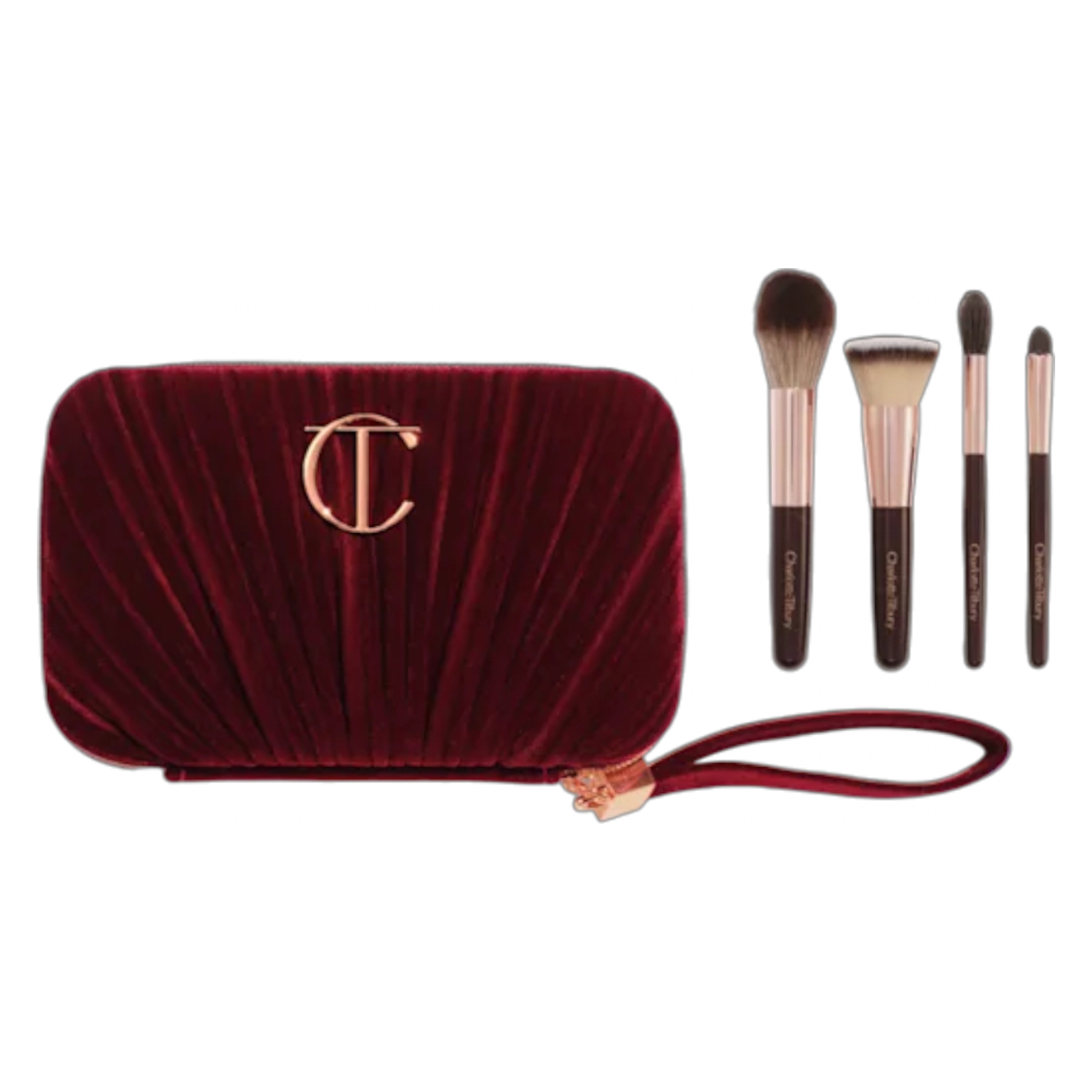 Charlotte's Hollywood Mini Brush Set — это лимитированный дорожный набор, включающий четыре миниатюрные кисти для лица и глаз, а также стильный вельветовый чехол цвета Night Crimson с зеркалом.