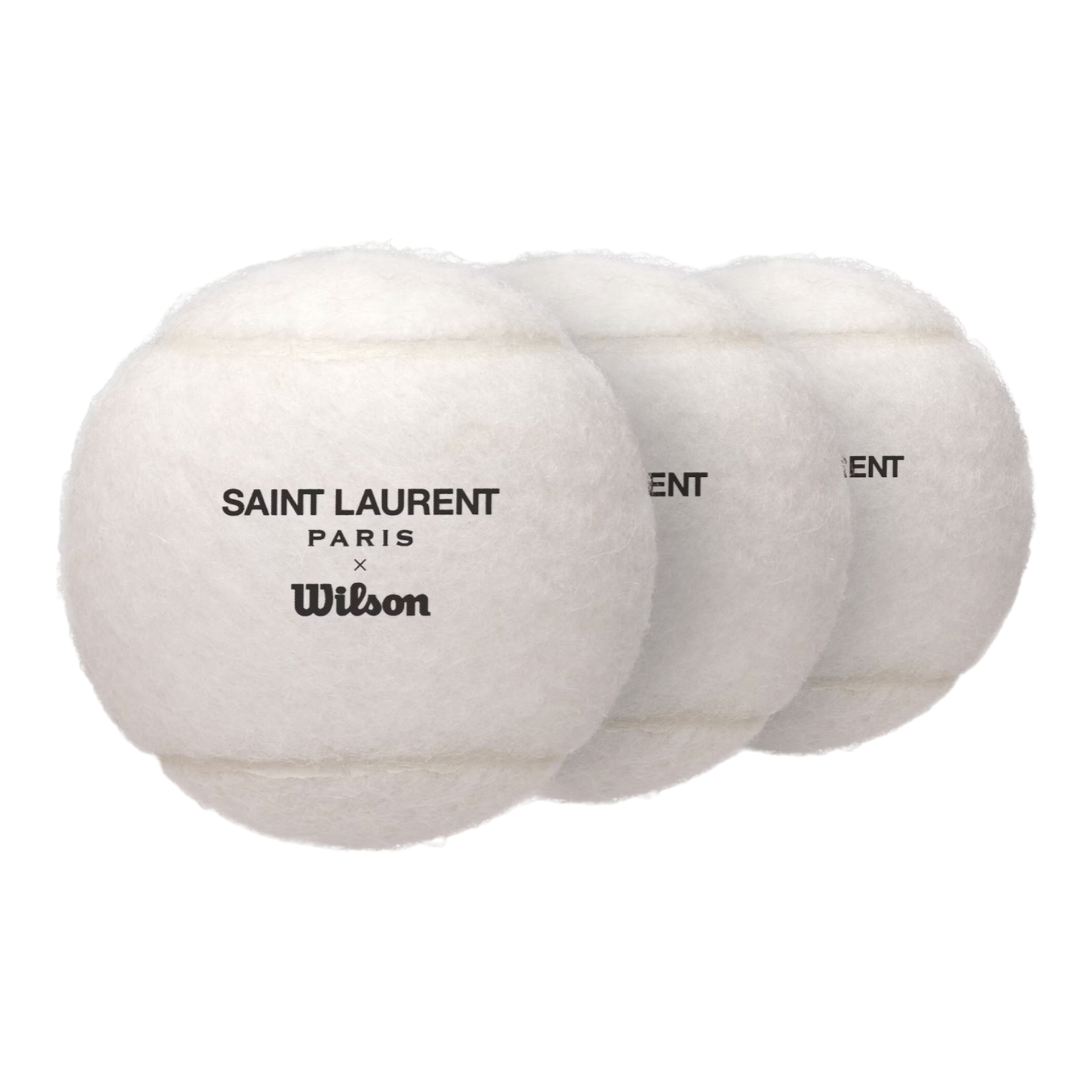 Набор белых теннисных мячей из коллаборации Saint Laurent x Wilson. Мячи подходят для профессиональных занятий теннисом. Дизайн отражает узнаваемую черно-белую эстетику и минимализм бренда Saint Laurent.