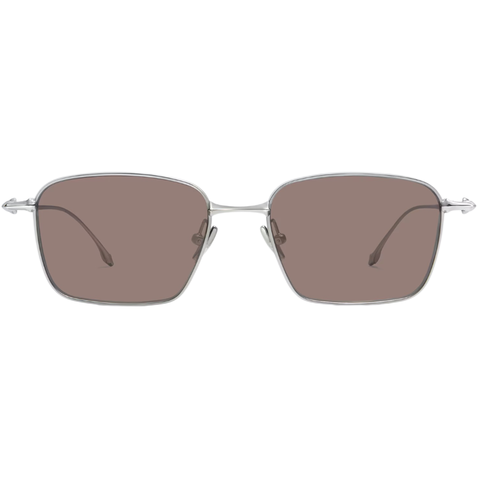 Солнцезащитные очки Gentle Monster из дерзкой коллекции BOLD. Очки имеют минималистичный дизайн с тонкой прямоугольной оправой и фигурными дужками глянцевого серебристого цвета и светло-коричневыми линзами, защищающими глаза от ультрафиолетовых лучей.