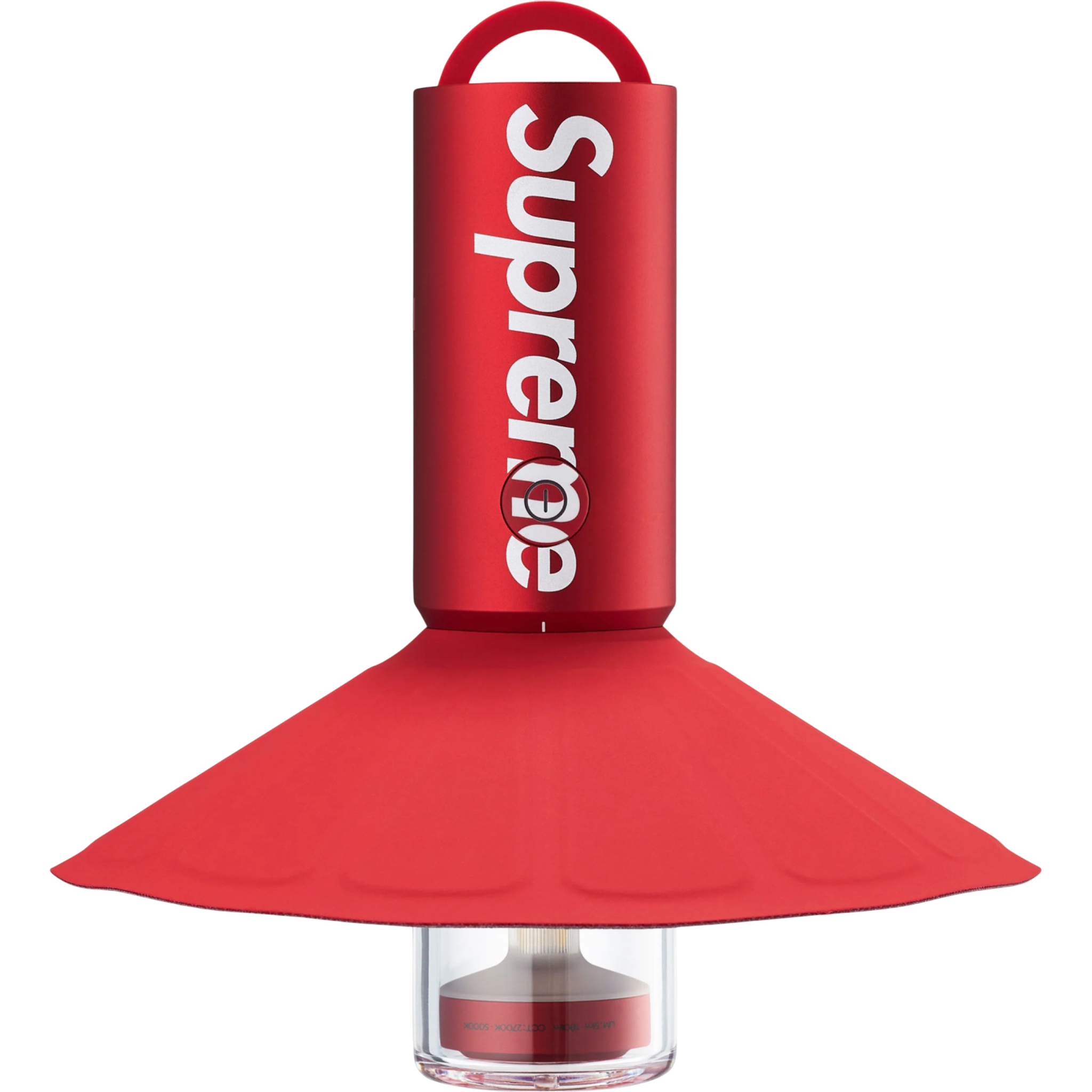 Лампа Supreme HOTO Camp Light — это беспроводной кемпинговый фонарь. Прочный и функциональный. Оснащен водонепроницаемым корпусом и долговечным плафоном из поликарбоната на алюминиевом основании. Яркость света регулируется от 50 до 180 люменов, а также можно настраивать цветовую температуру. Батарея емкостью 3100 мАч обеспечивает до 50 часов непрерывной работы (в зависимости от режима). Компактный дизайн дополнен фирменным логотипом Supreme.