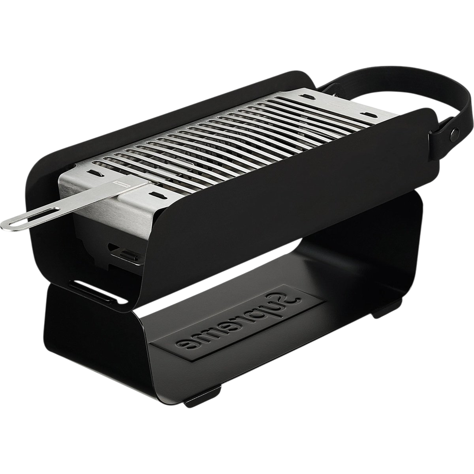 Функциональный аксессуар, где уличная культура встречается с ритуалом пикника — Supreme/UNA Grill. Компактный угольный гриль размером с обувную коробку, легко превращается из закрытого корпуса в рабочую поверхность всего за пару секунд. В корпус встроена кожаная ручка стропового типа с рельефным логотипом Supreme, подчёркивающая статусность изделия. Металлические элементы (из нержавеющей стали) можно мыть в посудомоечной машине — удобство, привычное для городской жизни. Гриль позволяет готовить на двух уровнях и оснащён отверстиями для шампуров — подходит и для посиделок с друзьями, и для небольшого кемпинга.