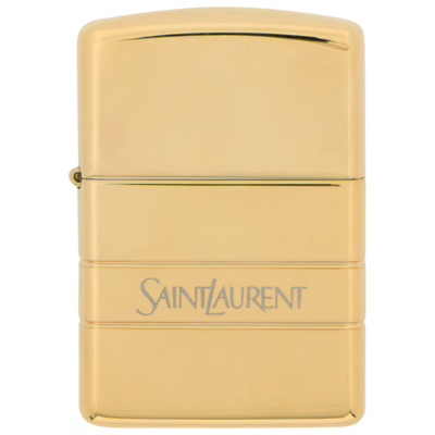 Зажигалка Zippo x Saint Laurent — эксклюзивный аксессуар, выпущенный в рамках коллаборации Дома Saint Laurent и легендарного производителя бензиновых зажигалок Zippo. Зажигалка выполнена из металла золотистого цвета и украшена фирменной гравировкой Saint Laurent по центру.