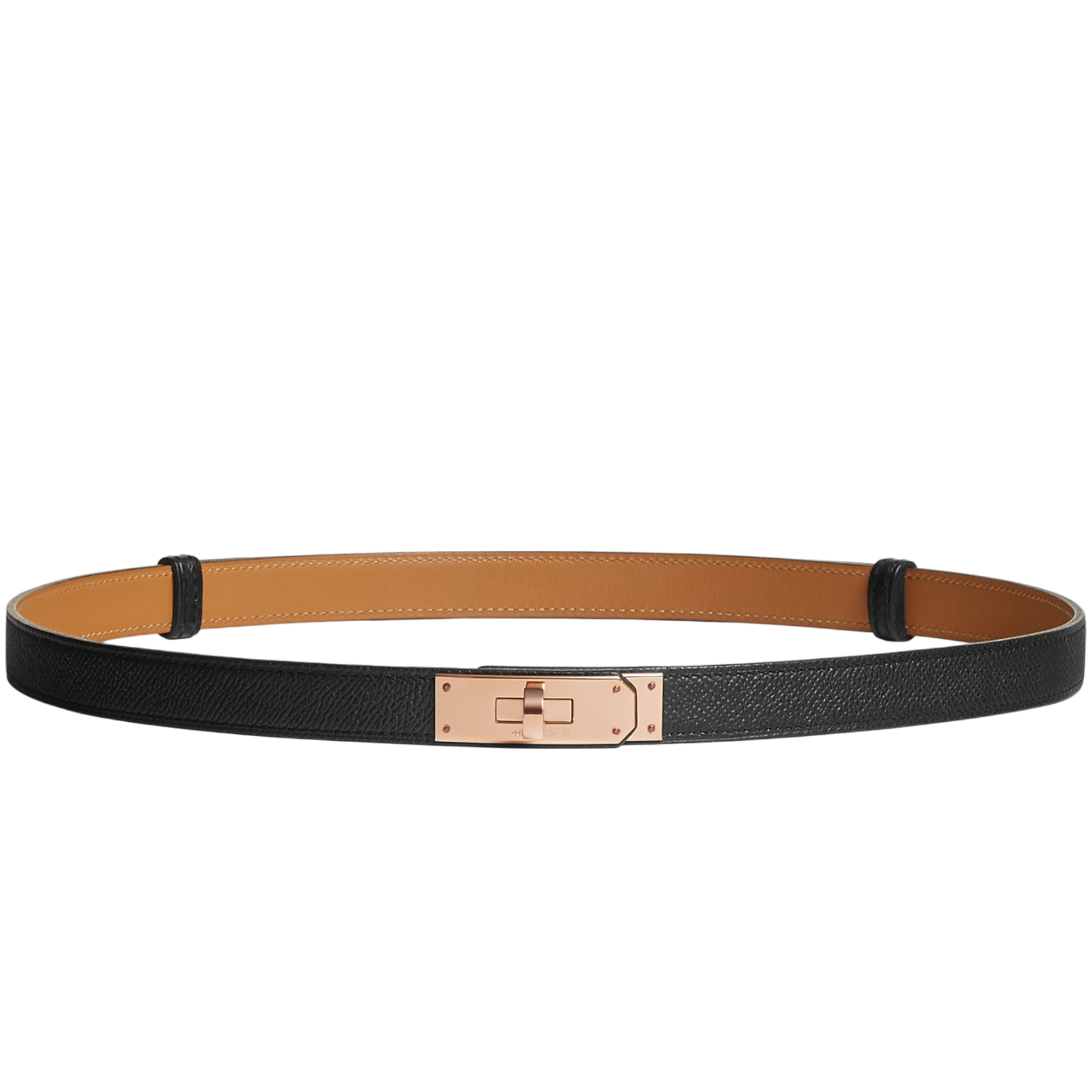 Ремень Hermes Kelly Belt 18 - знаковый аксессуаров французского бренда. Название ремень приобрел благодаря застежке, которая также расположена на знаменитой модели сумки Kelly, названной в честь голливудской актрисы. Основная особенность ремня - универсальность. Ремень идет в одном размере, его можно регулировать в зависимости от типа изделия и посадки. Ремень выполнен из черной кожи Epsom с застежкой из розового золота.