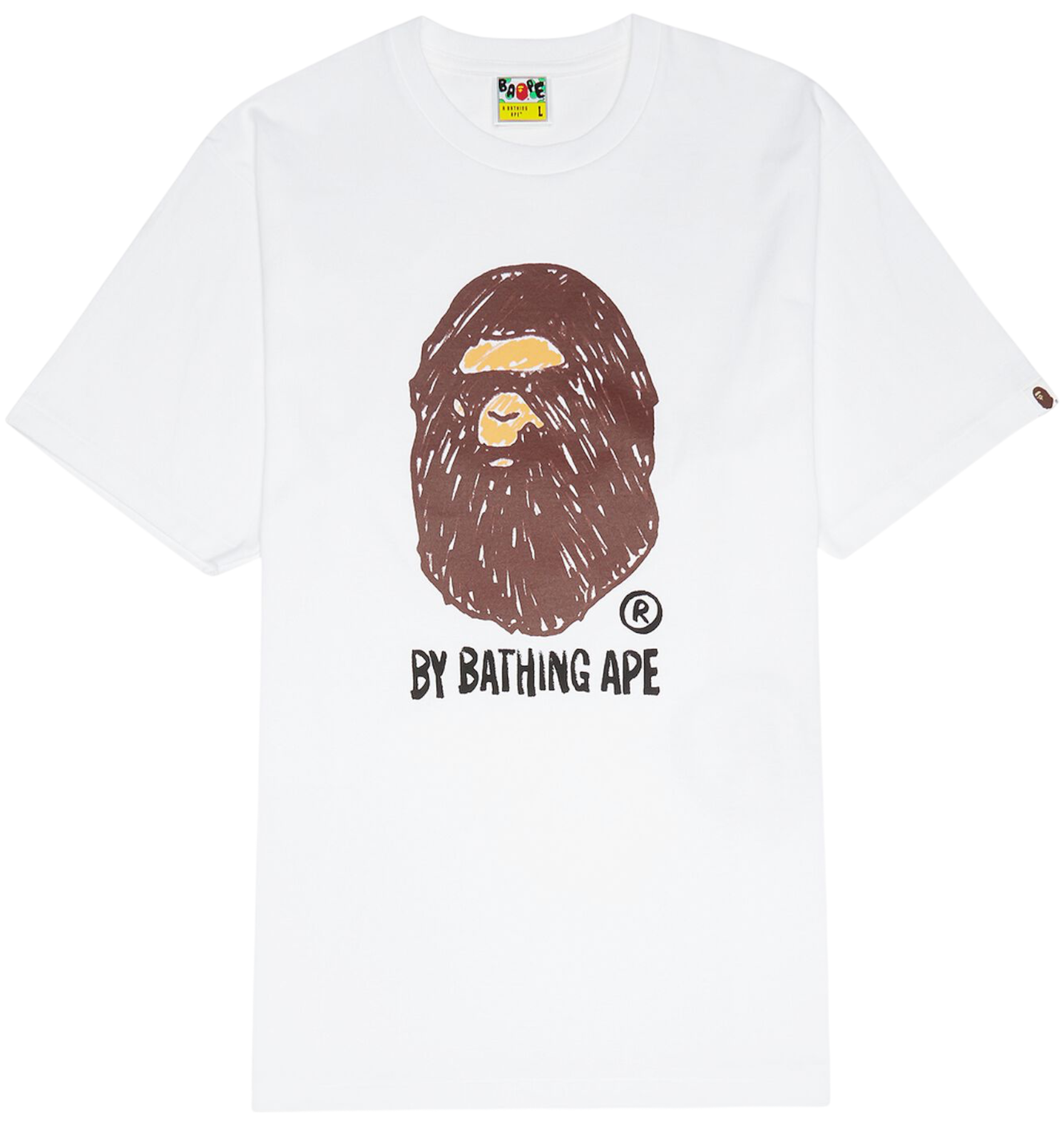 Футболка Bape с лаконичным, но привлекающим внимание дизайном. На футболке изображен фирменный принт "The Bathing Ape" с головой обезьяны, вдохновленный популярным в 70-х фильмом «Планета обезьян». Отличительная черты футболки - эффект рисовки от руки.
