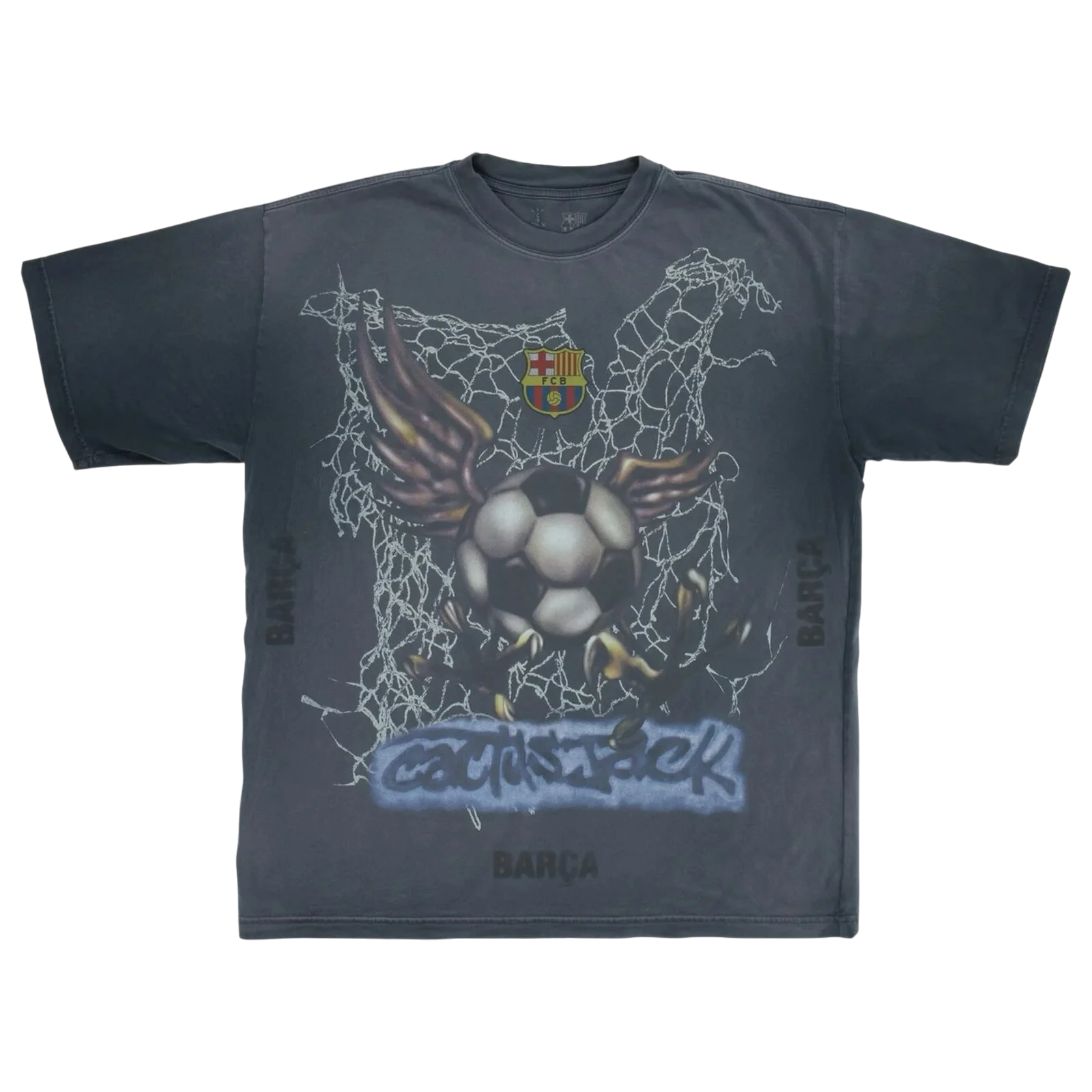 Лимитированное и яркое сочетание мира музыки, спорта и fashion — это коллаборация между Cactus Jack (Трэвис Скотт) и футбольным гигантом FC Barcelona. Футболка выполнена вклассическом, винтажом стиле меча Трэвиса Скотта. Этот релиз совпал с выступлением Трэвиса Скотта в Барселоне, осуществлённым в рамках легендарного El Clásico в 2025 году и стал частью кампании, в которой спорт встречается с музыкальной культурой. После презентации коллаборация стала одной из самых обсуждаемый и желанных.