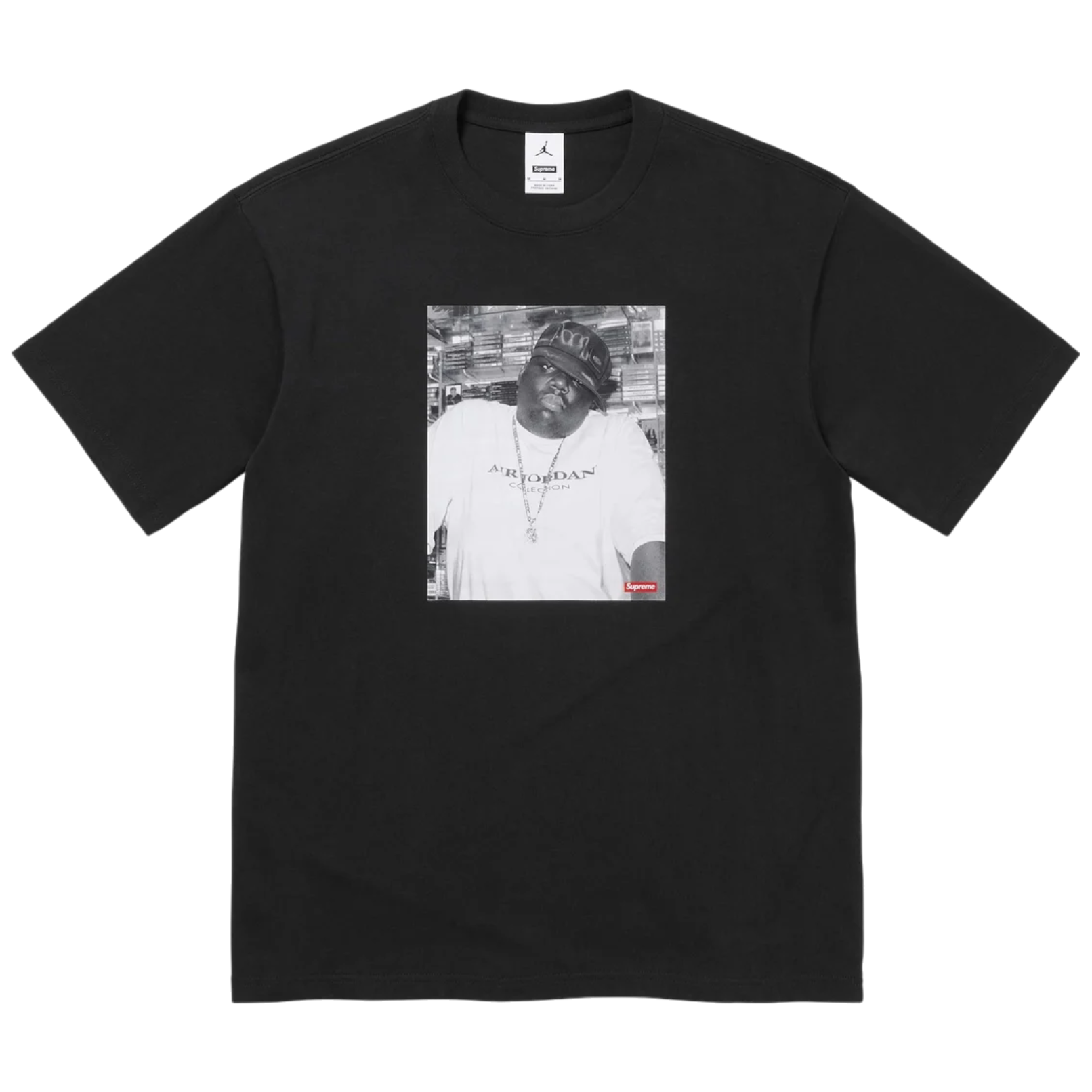 Лимитированная футболка из коллаборации Supreme x Jordan 2025 года с изображением легенды хип-хопа Notorious B.I.G. или Biggie в футболке Air Jordan Collection. Темой коллаборации стала эстетика 90-х, поэтому Biggie - закономерный герой.