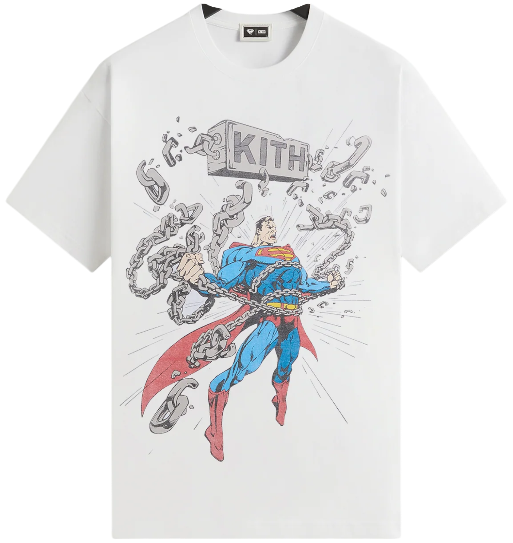 Футболка из эксклюзивной капсульной коллекции Kith x Superman, созданной в 2025 году в честь выхода нового фильма про Супермена. Футболка выполнена из плотного хлопка со специальной обработкой для создания винтажного эффекта. Принт на футболке выполнен в стиле комиксов DC и изображает Супермена, освобождающегося от цепей.