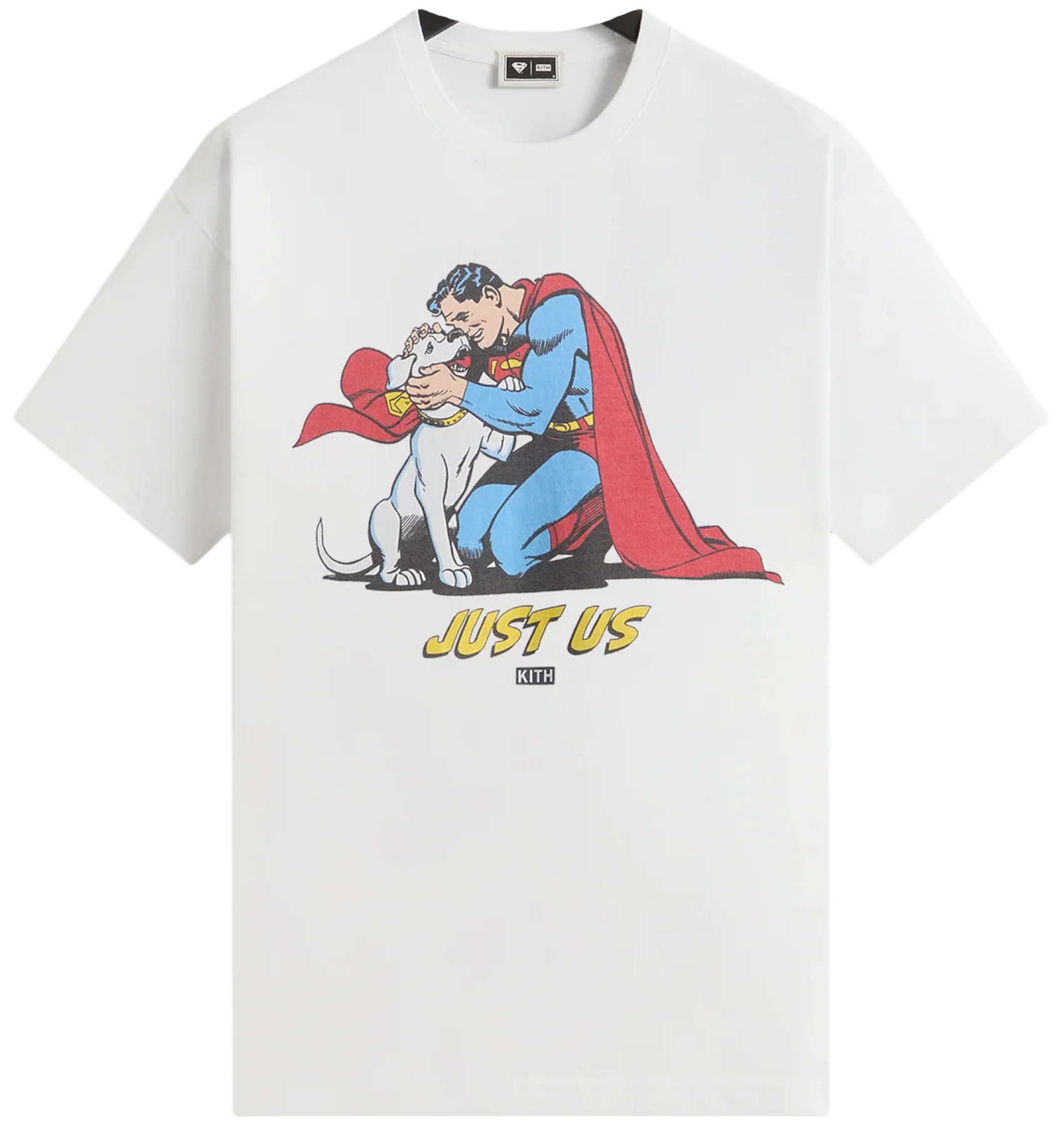 Футболка из эксклюзивной капсульной коллекции Kith x Superman, созданной в 2025 году в честь выхода нового фильма про Супермена. Футболка выполнена из плотного хлопка со специальной обработкой для создания винтажного эффекта. Принт на футболке изображает Супермена с его собакой Крипто, которая сыграла важную роль в новом фильме про Супермена. Трогательный принт дополнен слоганом бренда Kith “Just Us”.