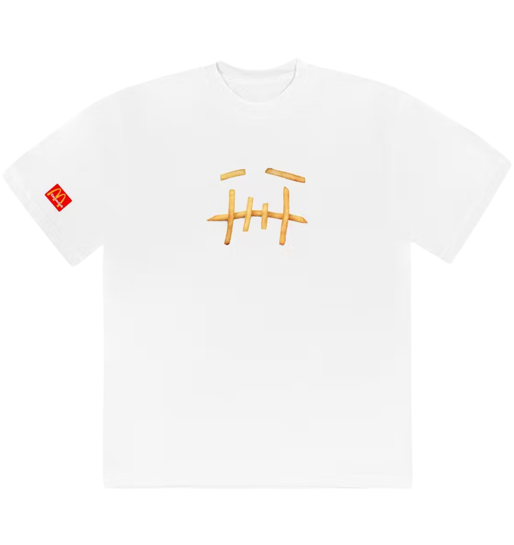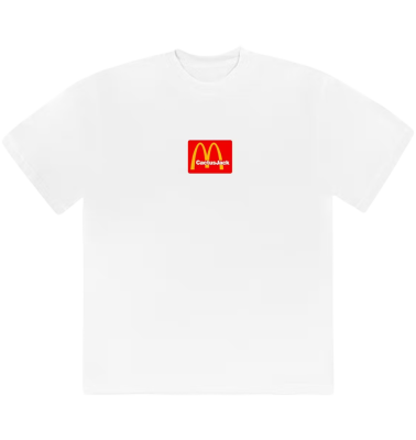 Футболка Travis Scott x Mcdonald’s – одна из самых желанных вещей из коллаборации известного репера и сетью быстрого питания. В рамках сотрудничества в 2020 году. McDonald’s добавили в меню комбо из любимых позиций Трэвиса, кроме того, была представлена коллекция одежды. Принт на футболке French Fries – это логотип музыкального лейбла Трэвиса Скотта Cactus Jack, выложенный из картошки фри.