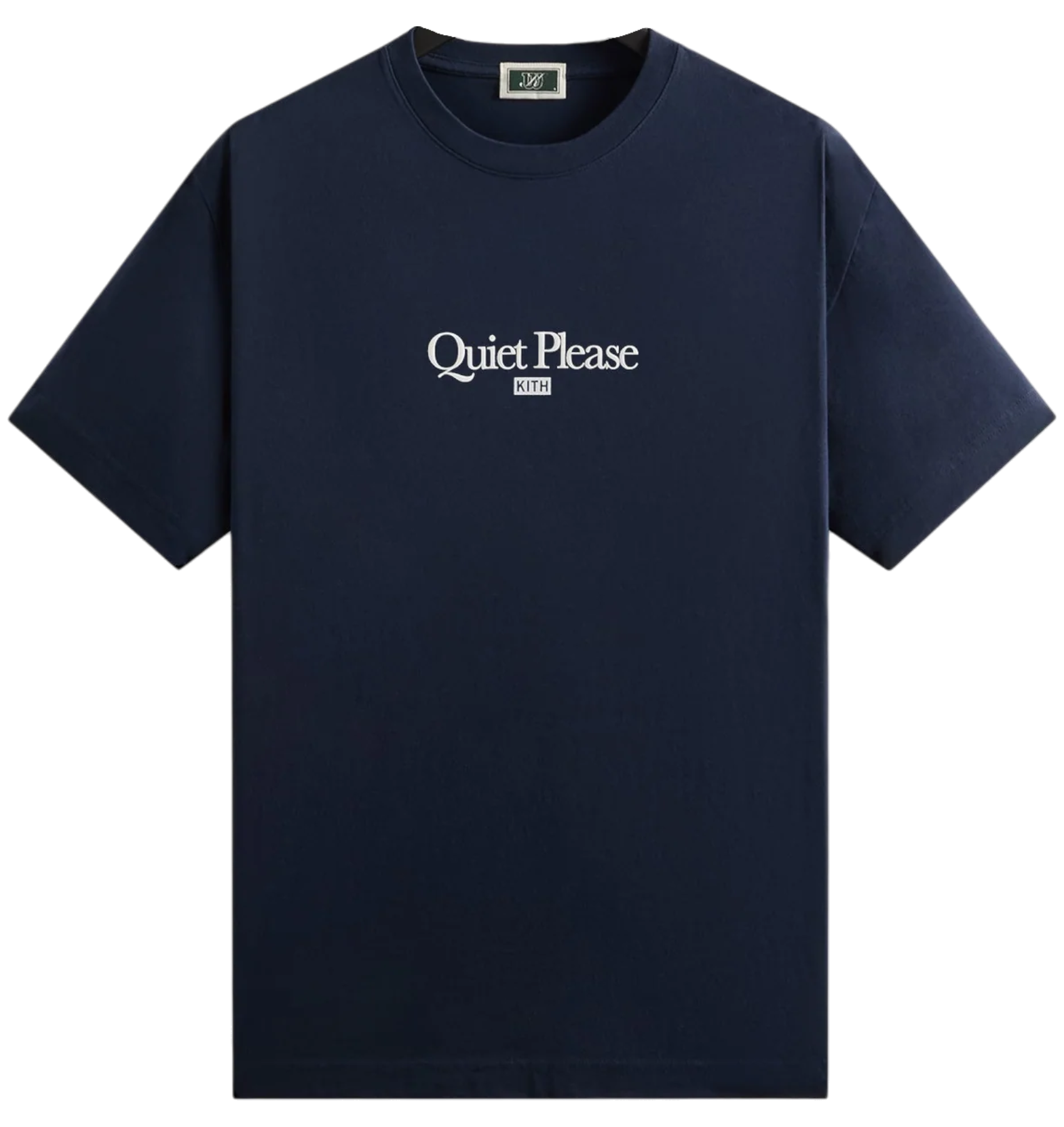 Футболка из теннисной коллаборации Kith x Wilson. Основной акцент на минималистичной футболке - это надпись "Quiet Please" ("тишина, пожалуйста"), нанесенная контрастным шрифтом. Эта надпись мгновенно создает ассоциацию с теннисом: ее произносят судьи перед началом сета, так как теннис требует тишины, игроки должны слышать мяч.