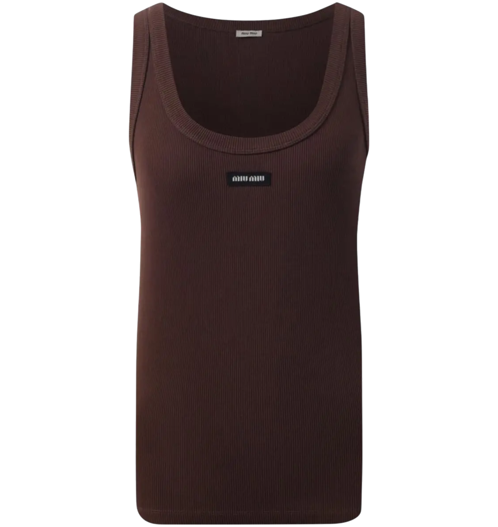 Майка Miu Miu в рубчик с минималистичной нашивкой в виде логотипа, которая выделяется на фоне элегантных линий этой майки, придавая ей культовый вид. Майка имеет прямой крой, выгодно подчеркивающий фигуру, а благодаря универсальному шоколадному оттенку, майка легко вписывается в любые образы.
