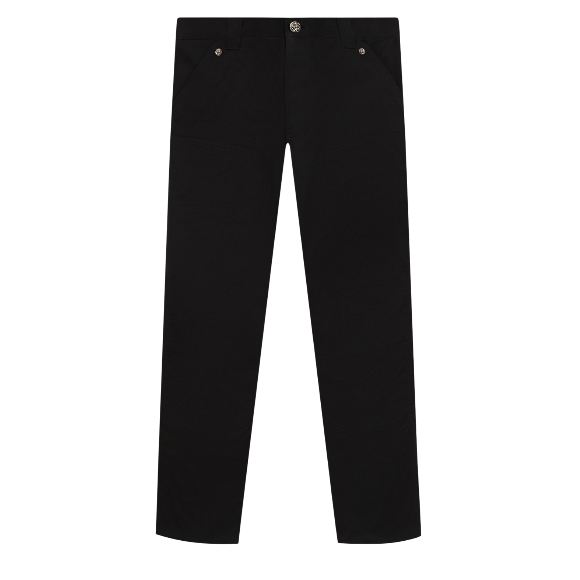 Редкие брюки от Chrome Hearts из 100% хлопка повторяющие знаменитый силуэт штанов Double Knee с вставками из серебра 925 пробы. Полностью черные штаны дополняют необычные детали: все пуговицы, в том числе и карманные, а также логотип Chrome Hearts на задней части выполнены из серебра 925 пробы с узором знаменитого цветка.