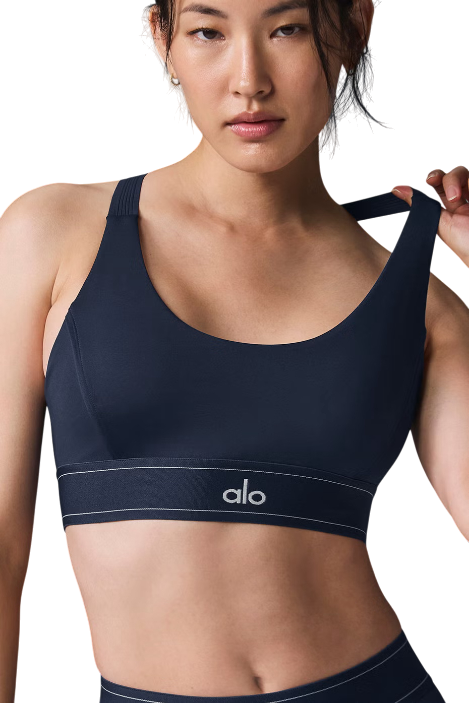 Airlift Suit Up Bra от Alo Yoga — спортивный топ средней поддержки (medium-impact), хорошо держит при движении. Материал — фирменная ткань Airlift: смесь 84 % полиэстера и 16 % эластана, плотное двойное трикотажное плетение (double-knit micro performance) — сочетание плотности и растяжимости. Регулируемые плечевые лямки, яркие декоративные швы (piping) подчёркивают форму и делают дизайн более выразительным. Подходит как для тренировок, так и для городской одежды.