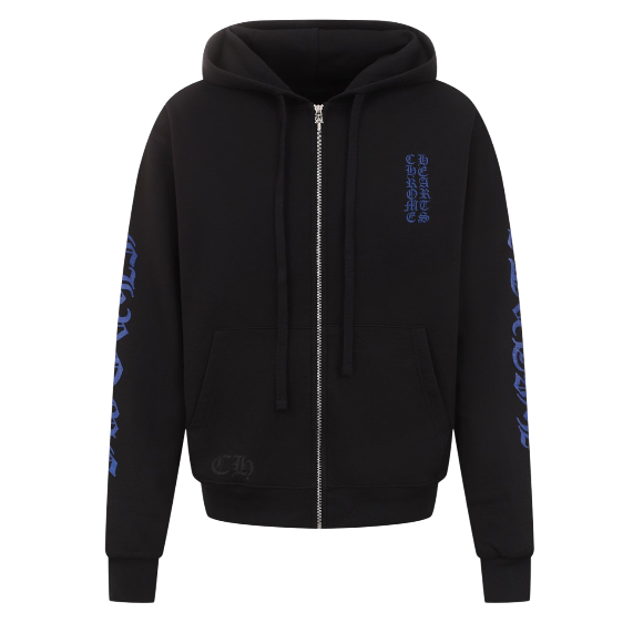 Классическая толстовка на молнии (zip-hoodie) от Chrome Hearts в чёрном цвете с контрастными синими принтами. Основной акцент сделан на фирменных надписях Chrome Hearts, размещённых на груди, рукаве и спине — узнаваемый элемент, ставший визитной карточкой бренда.
