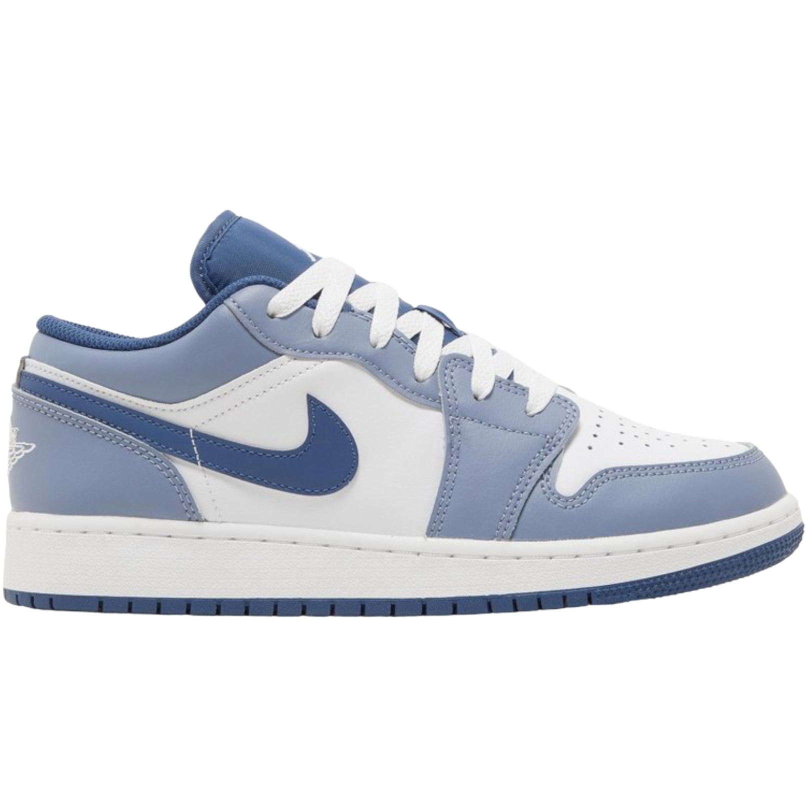 Air Jordan 1 Low Slate Blue - эта модель кроссовок выполнена из гладкой кожи с белой основой, темными и светлыми оттенками синего на накладках и нейлоновых язычках. Белые шнурки и промежуточная подошва поверх темно-синей резиновой подошвы дополняют дизайн.