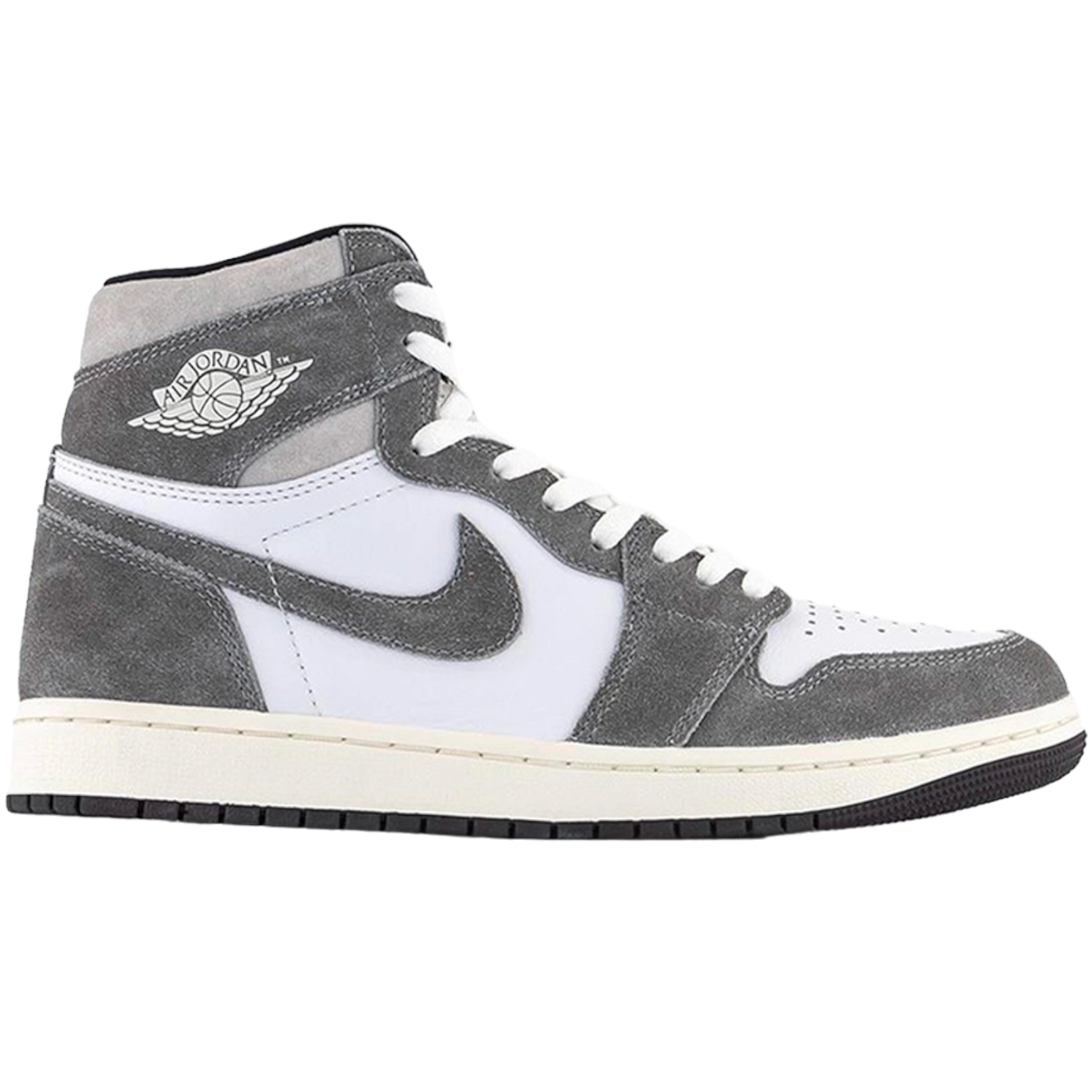 Модель Jordan 1 High имеет белую кожаную основу с перфорацией на носке, сочетающуюся с потёртыми серыми замшевыми вставками.
