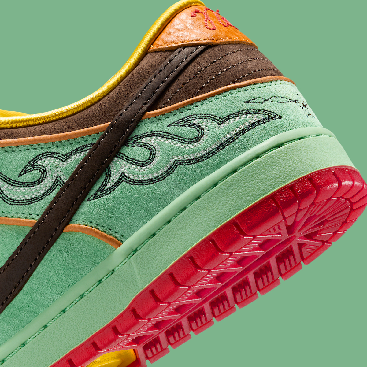 Эксклюзивная версия кроссовок Dunk SB Low, посвященная Месяцу Афроамериканской истории (BHM). Дизайн с текстурными шнурками и вышивкой в ковбойском стиле на пятке вдохновлен наследием чернокожих ковбоев Дикого Запада. Тематика также отражена в арте на стельке, который повторяет принт на платке, идущем в комплекте.