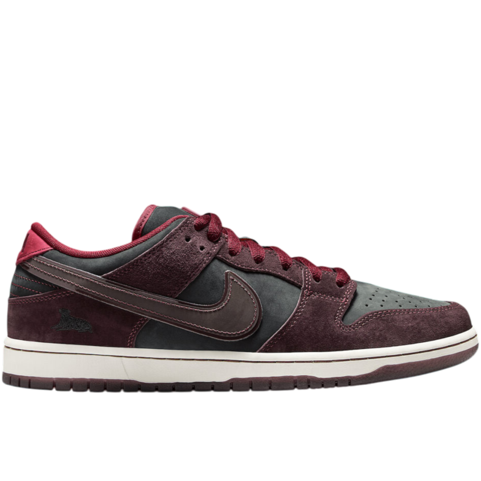 Скейтерская линейка Nike Dunk SB выбрала Riot Skateshop для коллаборации с низкой версией классических данков в 2025 году. Особенность магазина в том, что он находится в огромном погребе для вина, поэтому винная тематика отыграна в дизайне кроссовок за счет цвета красного вина, пробковой текстуры стельки и восковой печати с винной бутылки на язычке. Собака на логотипе Riot Skateshop – любимый лабрадор основателя.