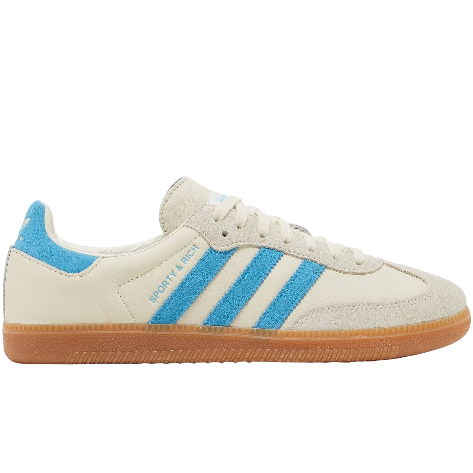 Коллаборация Sporty & Rich и Adidas преобразила классический дизайн Samba, добавив в него элементы роскоши, такие как премиальная замша, сатиновые детали на язычке и подкладке. В качестве элементов брендинга используется фирменный золотой оттиск «SPORTY & RICH», заменяющий привычное «SAMBA».