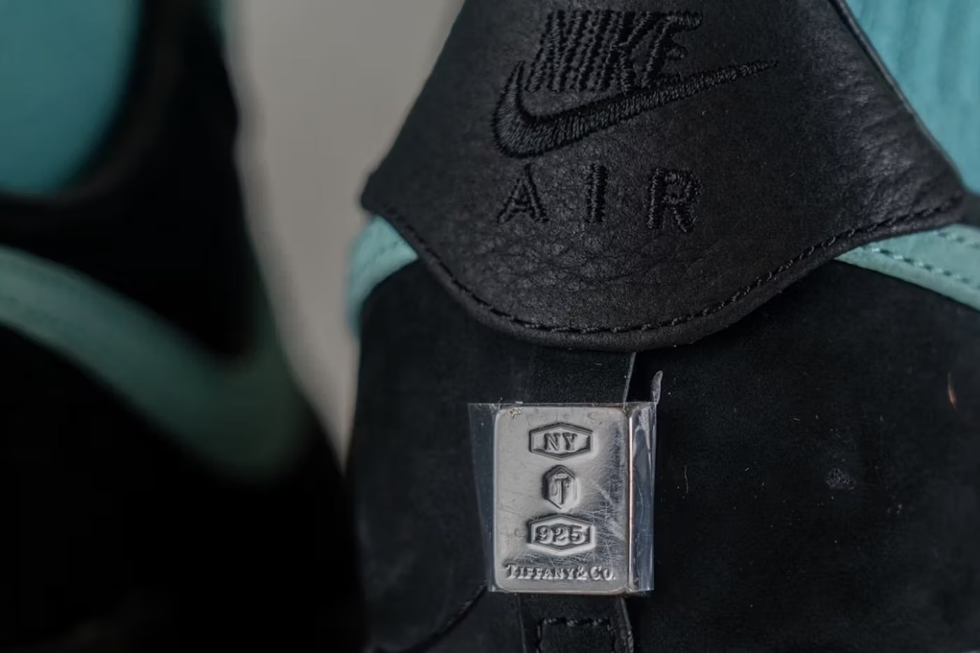 Верх кроссовка выполнен из замши черного цвета с контрастными элементами из серебра 925 пробы на пятке и язычке. Боковой свуш из тисненой замши окрашен в фирменный оттенок Tiffany Blue, который также присутствует на дополнительных шнурках. Мягкая кожаная подкладка черного цвета обеспечивает комфорт и износостойкость. Подошва кроссовка выполнена из резины белого цвета с воздушной подушкой Air в пятке для амортизации.
