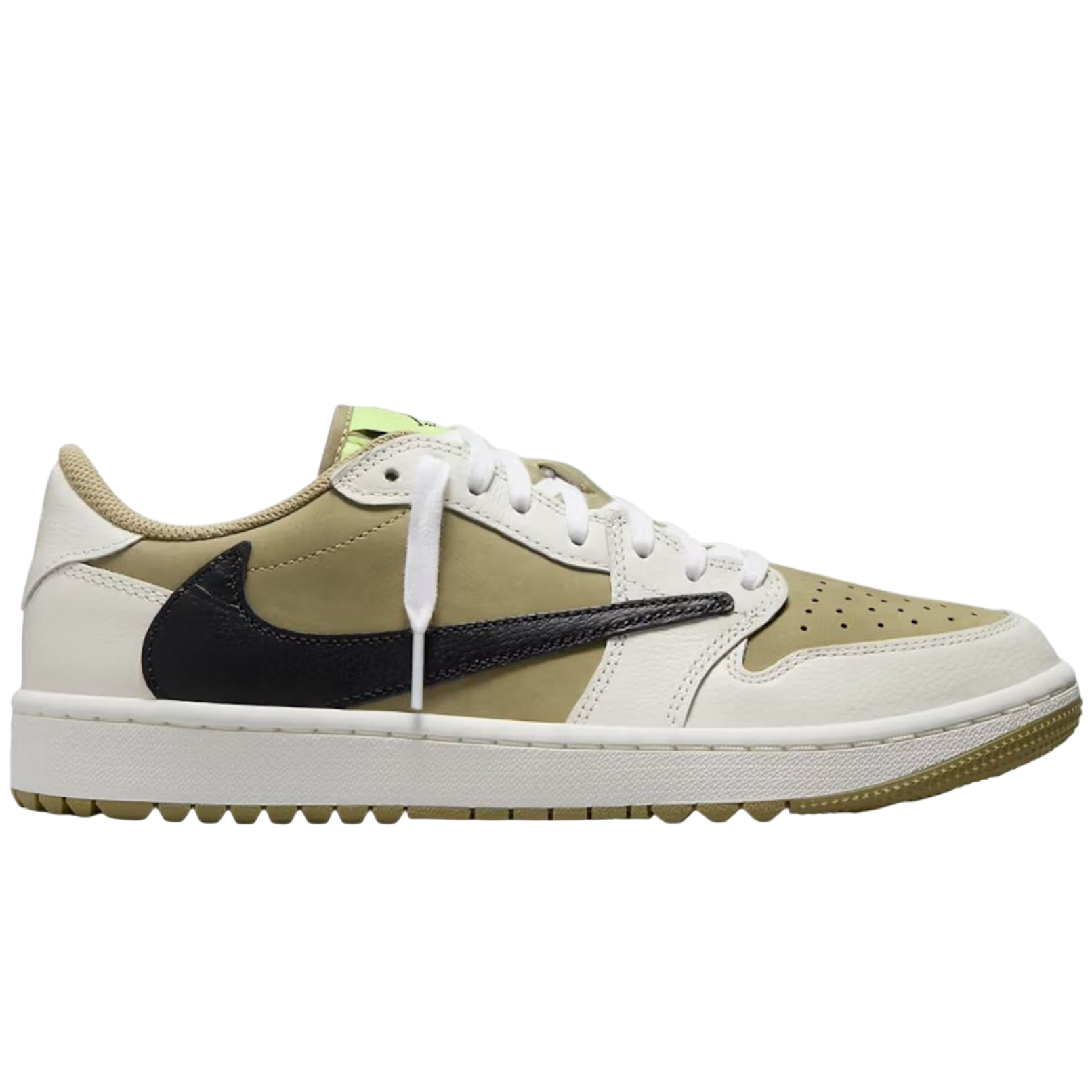 Кроссовки Travis Scott x Air Jordan 1 Low Golf Natural Olive представляют собой элегантное и инновационное сотрудничество между известным рэп-исполнителем и легендарным брендом Jordan. Эта модель, разработанная специально для гольфа, сочетает в себе культовый дизайн Air Jordan 1 с функциональностью и комфортом для игры в гольф.