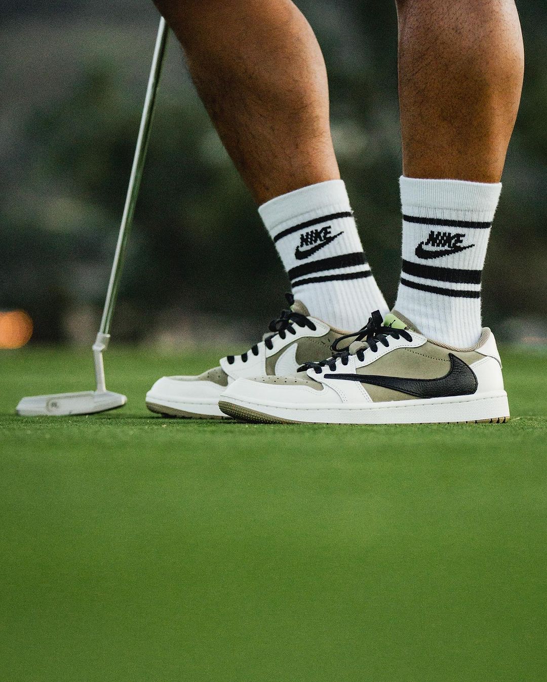 От гольфа в кроссовках Travis Scott x Air Jordan 1 Low Golf Natural не только цветовое решение в оттенках, создающих ассоциацию с природой и полем для гольфа, но и функциональные детали, такие как, например, специальная подошва, обеспечивающих надежное сцепление с поверхностью и устойчивость во время ударов.